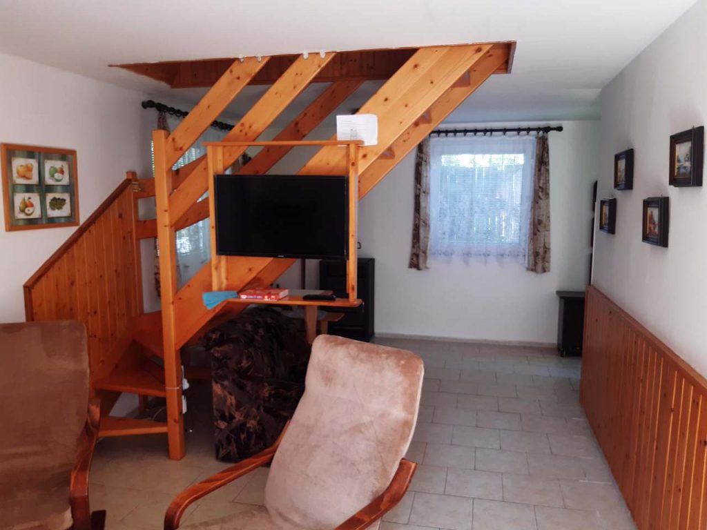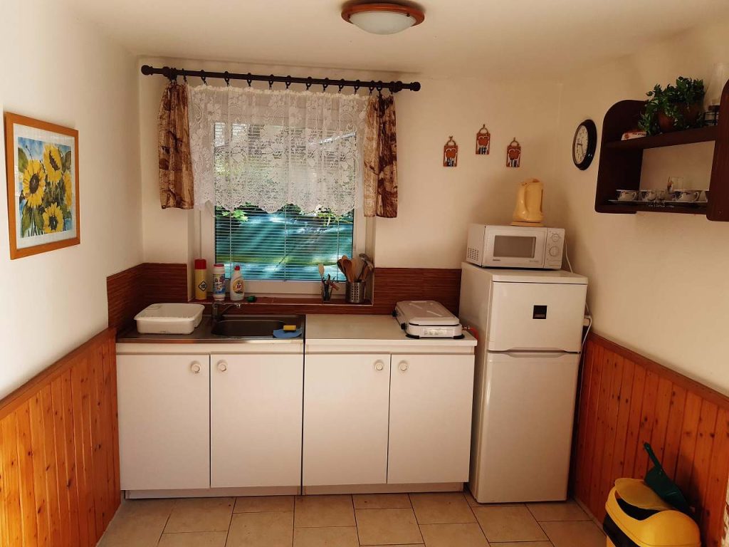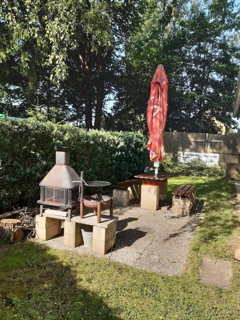 Chata nabízí plně vybavenou kuchyň umístěnou v přízemí a grilovací koutek na zahradě.